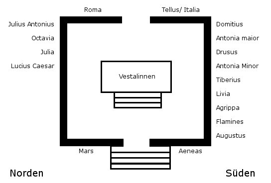 Zuerst stehen zwei Liktoren (nicht im Bild), dann Augustus zwischen zwei